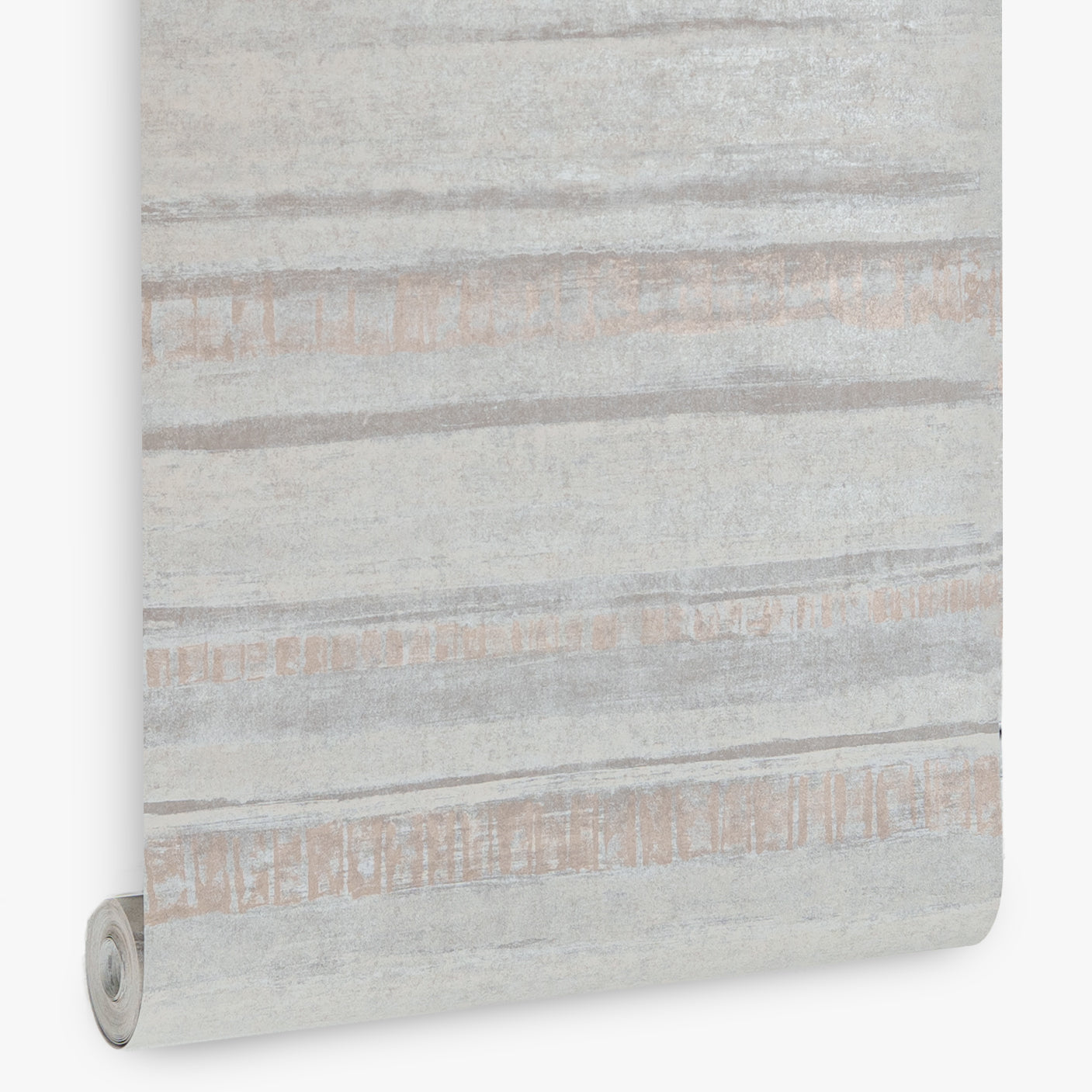Papel de colgadura con franjas difuminadas tipo strata sobre base greige/taupe. Integra vetas cálidas y un sutil acabado metálico en oro rosado que genera destellos elegantes y modernos.
